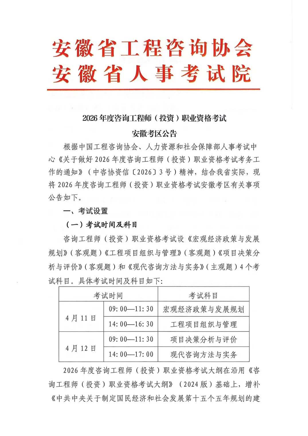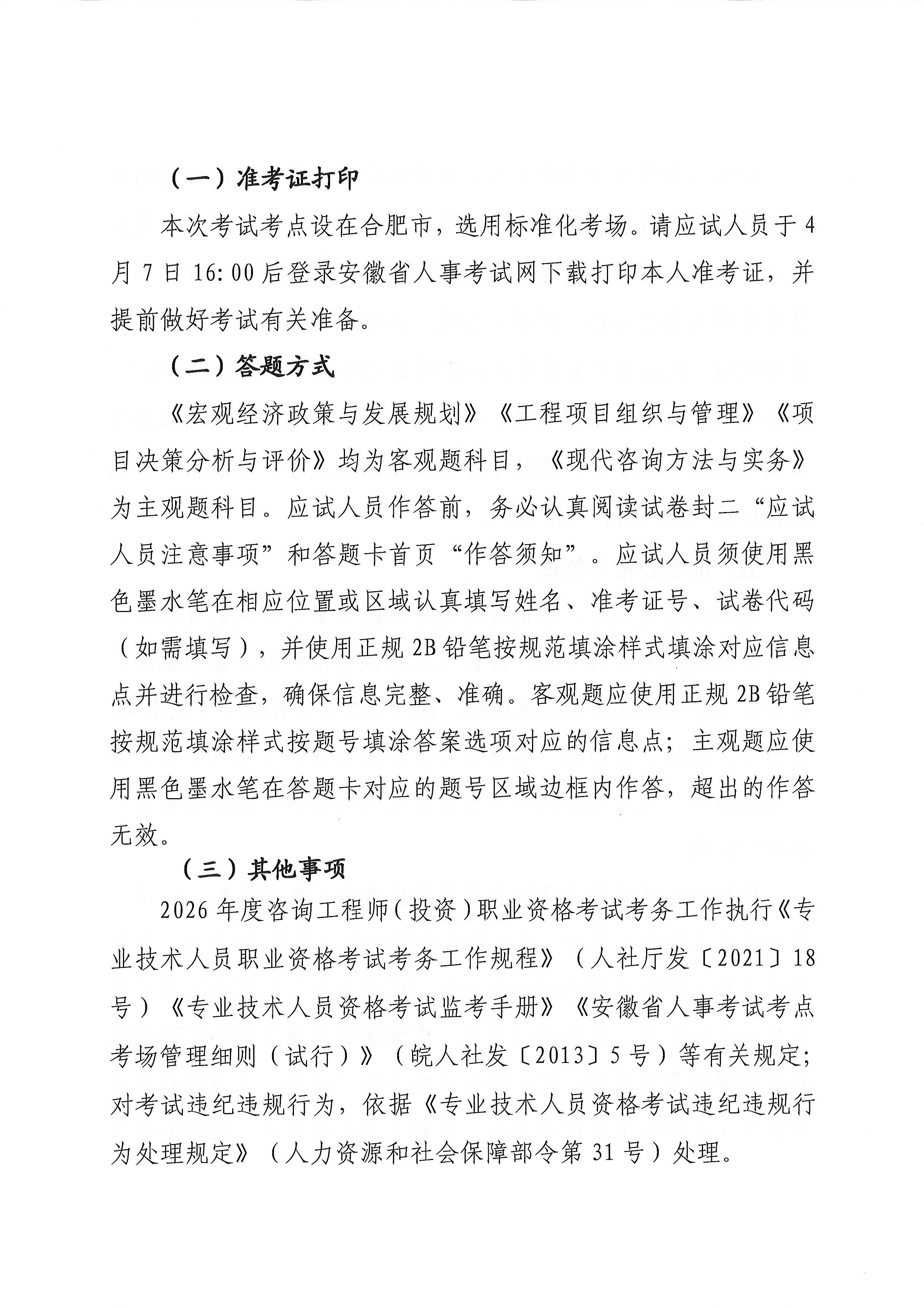 2026年度咨询工程师(投资)职业资格考试安徽考区公告