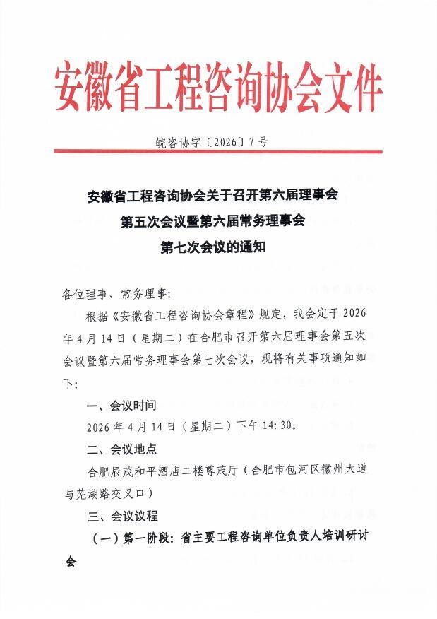 安徽省工程咨询协会关于召开第六届理事会第五次会议暨第六届常务理事会第七次会议的通知